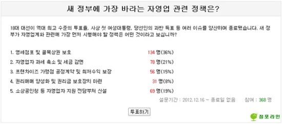 자영업자 간 점포거래 전문사이트 점포라인(www.jumpoline.com)이 자사 홈페이지를 통해 이달 16일부터 실시한 ‘새 정부에 가장 바라는 자영업 관련 정책은?’ 제하의 설문조사 결과 응답자 368명 중 ‘영세 자영업자 및 골목상권 보호’를 선택한 응답자는 134명(36%)으로 가장 많았다.