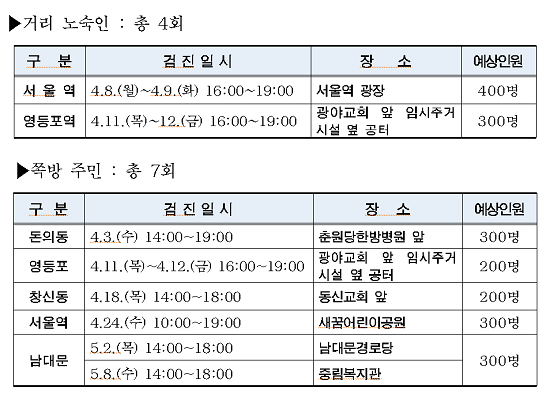 서울역, 영등포역 등 노숙인 밀집 지역과 쪽방촌 지역인 돈의동 등 5개소에서 4월 3일(수)부터 5월 8일(수)까지 결핵 검진을 시행한다.