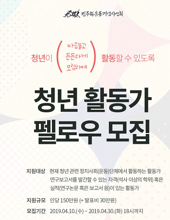 민주화운동기념사업회(이사장 지선)가 청년 정치사회(운동) 단체에 몸담은 청년 활동가를 대상으로 소정의 연구활동비를 지원하는 <청년 활동가 펠로우>를 4월 30일(화)까지 모집한다고 12일 오전 밝혔다. <청년 활동가 펠로우>는 청년세대 활동가들과의 연계망 구축 및 민주화운동기념사업회의 연구영역 확대가 목표이다. 모집을 통해 선정된 <청년 활동가 펠로우>에게는 연구보고서 작성을 위한 150만 원 상당의 연구비가 지원되며(현장 활동 관련 발표 시 발표비 30만원 별도 지급) 민주화운동기념사업회 연구소 월례포럼 발표 및 청년 활동가들 간의 활동 공유, 민주화운동세대와의 교류 등의 기회도 주어질 예정이다. 지원 자격은 청년 관련 단체(정당, 사회운동 단체 및 네트워크형 조직 포함)에서 활동하고 있으며 연구보고서를 발간할 수 있는 자격(석사 이상의 학위) 혹은 실적(연구논문 혹은 보고서 등)이 있는 청년 활동가라면 누구나 지원할 수 있다. 지원을 원하는 청년 활동가는 4월 30일(화)까지 민주화운동기념사업회 홈페이지에서 지원서와 연구계획서를 내려받아 작성한 뒤 이메일로 제출하면 된다. 심사결과는 5월 중 사업회 홈페이지를 통해 확인할 수 있다. 민주화운동기념사업회는 민주화운동 정신을 계승·발전시키기 위해 설립된 행정안전부 산하 공공기관으로서 한국 민주주의의 100년을 담은 연구 지평을 확대하는 데 이바지하기 위해 ‘민주화운동기념사업회 한국민주주의연구소’를 운영하고 있다. 지선 민주화운동기념사업회 이사장은 “청년세대는 한국 민주주의의 현재와 미래”라며 “앞으로 이들의 활동이 더 많은 관심과 조명을 받을 수 있도록, 청년세대와 함께하는 다양한 사업 추진을 통해 미래세대 발전을 위해 최선을 다하겠다”고 밝혔다.