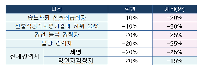 선출직 공직자가 중도사퇴로 보궐선거를 야기하는 경우와 선출직 공직자 평가결과 하위 20%에 대한 감산을 이전 10%에서 20%로 강화하고 경선불복 경력자‧탈당 경력자는 감산 20%에서 25%로, 중앙당 징계 중 제명 경력자는 감산 20%에서 25%로 강화했다. 다만 당원자격 정지 경력자는 종전 20%에서 15%로 감산을 완화했다.
