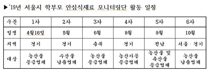 학교급식재료 산지에 직접 방문해 식재료 공급부터 유통경로의 전 과정을 점검하는 초‧중‧고 학부모들로 구성된 ‘서울시 학부모 안심식재료 모니터링단’이 올 10월까지 서울, 경기, 충북, 전남 전국 각지를 돌며 서울시내로 공급되는 학교급식재료를 점검한다.