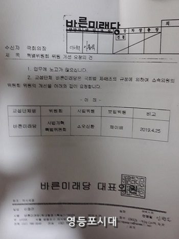 바른미래당 이찬열 의원(오른쪽 사진)이 25일 발표한 성명서를 통해 자당 소속의 유승민 의원에게 “꼭두각시 데리고 자유한국당으로 돌아가라”고 일침을 가하며 덧붙인 내용이다. 이찬열 의원은 이날 “국회선진화법에서 규정한 정당한 절차인 ‘패스트 트랙’을 막겠다며 농성을 하고, 국회의장까지 찾아가 막무가내로 행패를 부린 자유한국당은 논할 가치조차 없다”고 강조하고 “가장 가관은 유승민 의원이었다”며 강하게 비판했다. 이 의원은 유승민 의원을 향해 “명색이 대한민국 대선후보였고 바른미래당 대표였다는 사람이 원내대표의 정당한 권한인 의원 사보임을 막겠다며 국회사무처 의사과 사무실을 점거하고 있는 모습을 보면서 자유한국당에서는 참으로 대견해 했을지 모르겠지만, 지난 대선에서 그를 찍었던 국민들은 손가락을 원망했을 것이다”라면서 “의원총회에서 투표로 결정된 패스트 트랙을 어떻게든 막겠다는 행태가 자유한국당 의원인지 바른미래당 의원인지 헷갈릴 지경이다”며 비판의 강도를 높였다. 이찬열 의원은 “그가 보여준 모습은 자유한국당에 “나 좀 데려가 줘, 너희를 위해 이렇게 열심히 하잖아”라고 애타게 구애하는 것인지 묻지 않을 수 없다”며 “그가 왜 세간에서 ‘좁쌀 정치’를 하는 ‘좁쌀영감’이라 불리는지도 잘 알 수 있었다”고 주장했다.