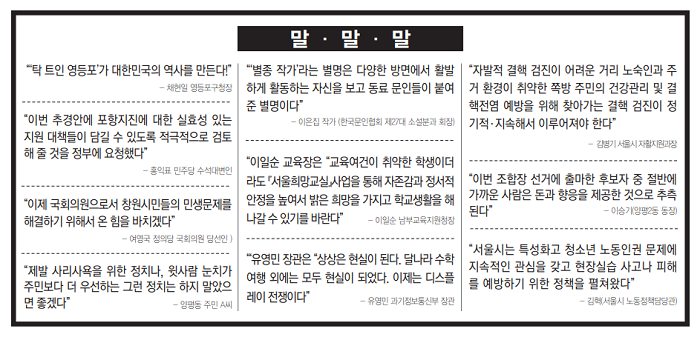 채현일 영등포구청장 “이번 추경안에 포항지진에 대한 실효성 있는 지원 대책들이 담길 수 있도록 적극적으로 검토해 줄 것을 정부에 요청했다” 홍익표 민주당 수석대변인 “이제 국회의원으로서 창원시민들의 민생문제를 해결하기 위해서 온 힘을 바치겠다” 여영국 정의당 국회의원 당선인 “제발 사리사욕을 위한 정치나, 윗사람 눈치가 주민보다 더 우선하는 그런 정치는 하지 말았으면 좋겠다” 양평동 주민 A씨 “‘별종 작가’라는 별명은 다양한 방면에서 활발하게 활동하는 자신을 보고 동료 문인들이 붙여준 별명이다” 이은집 작가 (한국문인협회 제27대 소설분과 회장) 이일순 교육장은 “교육여건이 취약한 학생이더라도 『서울희망교실』사업을 통해 자존감과 정서적 안정을 높여서 밝은 희망을 가지고 학교생활을 해나갈 수 있기를 바란다” 이일순 남부교육지원청장 “상상은 현실이 된다. 달나라 수학여행 외에는 모두 현실이 되었다. 이제는 디스플레이 전쟁이다” 유영민 과기정보통신부 장관 “자발적 결핵 검진이 어려운 거리 노숙인과 주거 환경이 취약한 쪽방 주민의 건강관리 및 결핵전염 예방을 위해 찾아가는 결핵 검진이 정기적‧지속해서 이루어져야 한다" “이번 조합장 선거에 출마한 후보자 중 절반에 가까운 사람은 돈과 향응을 제공한 것으로 추측된다” 남대니 한국선거연구소 소장