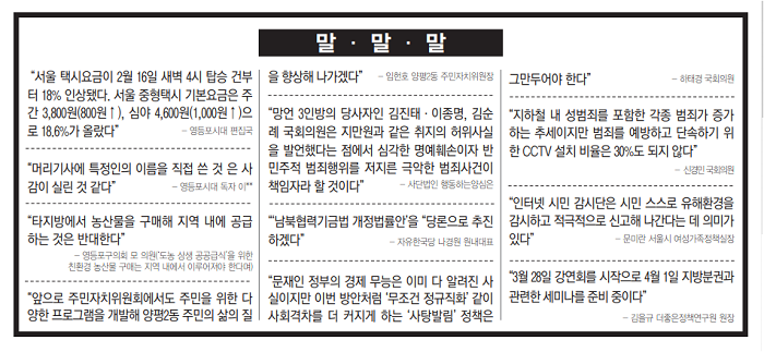 영등포시대 편집국 “머리기사에 특정인의 이름을 직접 쓴 것 은 사감이 실린 것 같다” 영등포시대 독자 이** “타지방에서 농산물을 구매해 지역 내에 공급하는 것은 반대한다” 영등포구의회 모 의원(‘도농 상생 공공급식’을 위한 친환경 농산물 구매는 지역 내에서 이루어져야 한다며) “앞으로 주민자치위원회에서도 주민을 위한 다양한 프로그램을 개발해 양평2동 주민의 삶의 질을 향상해 나가겠다” 임헌호 양평2동 주민자치위원장 “망언 3인방의 당사자인 김진태·이종명, 김순례 국회의원은 지만원과 같은 취지의 허위사실을 발언했다는 점에서 심각한 명예훼손이자 반민주적 범죄행위를 저지른 극악한 범죄사건이 책임자라 할 것이다” 사단법인 행동하는양심은 “‘남북협력기금법 개정법률안’을 “당론으로 추진하겠다” 자유한국당 나경원 원내대표 “문재인 정부의 경제 무능은 이미 다 알려진 사실이지만 이번 방안처럼 ‘무조건 정규직화’ 같이 사회격차를 더 커지게 하는 ‘사탕발림’ 정책은 그만두어야 한다” 하태경 국회의원 “지하철 내 성범죄를 포함한 각종 범죄가 증가하는 추세이지만 범죄를 예방하고 단속하기 위한 CCTV 설치 비율은 30%도 되지 않다” 신경민 국회의원 “인터넷 시민 감시단은 시민 스스로 유해환경을 감시하고 적극적으로 신고해 나간다는 데 의미가 있다” 문미란 서울시 여성가족정책실장 “3월 28일 강연회를 시작으로 4월 1일 지방분권과 관련한 세미나를 준비 중이다” 김을규 더좋은정책연구원 원장 “이번 당산지구 중심 지구단위계획 결정(변경)이 당산 환승역세권의 활성화로 이어져 지역경제에 활력을 불어넣을 것으로 기대한다” 서울시 관계자 “의정활동 모니터링 단과 관련한 조례제정을 준비해 오고 있다” 김길자 영등포구의회 운영위원장 "이제 삼성의 3세 승계작전은 완전 무리였다는 게 삼바에서 드러나고 있다" 이선근 민생연대 대표