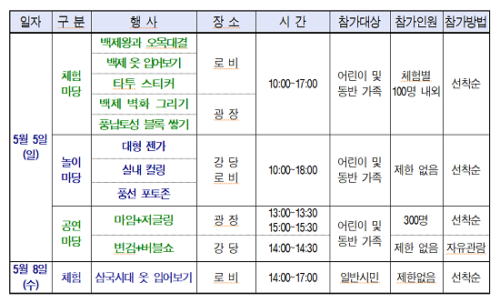 이번 행사는 5월 5일(일) 어린이날 오전 10시부터 오후 6시까지 한성백제박물관 광장 및 로비, 강당에서 진행될 예정이다. 행사는 체험마당, 놀이마당, 공연마당으로 구성되어 있으며 시민 누구나 무료로 참가할 수 있다.