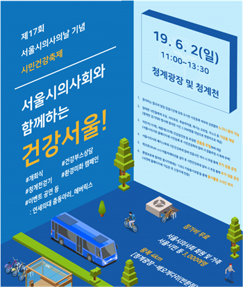서울특별시의사회(회장 박홍준)는 오는 6월 2일(일) 오전 11시 청계광장 소라 상 앞에서 ‘제17회 서울시 의사의 날 기념 시민건강축제’를 개최한다고 11일 오전 밝혔다. 이번에 열리는 ‘서울시 의사의 날 기념 시민건강축제’는 의사회원과 가족 서울시민이 함께하는 행사로 서울특별시의사회가 서울시민에게 다가가는 의사 상을 구현을 위한 취지로 열린다. 서울시민들에게 건강정보를 제공하고 ‘1365 자원봉사 포털’을 통한 사전신청 후 쓰레기 줍기 등 환경보호 걷기대회에 참가한 시민과 학생은 봉사활동 3시간을 받는다. 참가비 없이 진행될 예정인 이날 행사는 사전등록과 관계없이 현장에서 직접 참여할 수 있으며 완주한 시민에게 자전거, 체중계, 건강검진권 등의 상품을 추첨을 통해 제공한다. 이번 행사는 오전 11시 개회식을 시작으로 11시 50분에 건강부스 상담 및 걷기대회가 본격적으로 진행되며, 왕복 4km의 코스(청계광장→배오개다리(반환점)→청계광장)를 완주 후 밴드(squidclam)와 메버릭스(연세의대 춤 동아리) 공연 후 13시 30분 경품 추첨을 끝으로 마무리할 예정이다. 이날 행사는 3,000여 명의 시민과 의사회원 및 가족들이 함께하는 행사로 서울시와 서울시 의회, 서울시 교육청, 서울시 중구, 유관기관(공단, 심평원)의 후원과 25개 구분 회 및 32개 특별 분회 의사회원이 참여할 예정이다.