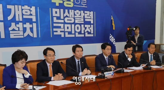 이인영 원내대표를 위시해 조정식 정책위의장, 윤후덕 예결위간사, 윤관석 정책위 수석부의장, 김영호, 고용진, 표창원, 서삼석, 김정호, 박경미, 제윤경, 이규희, 맹성규, 임종성 원내부대표, 박찬대, 정춘숙 원내대변인, 이원욱 원내수석부대표 등이다. 민주당 이인영 원내대표는 14일 오전 민주당 제4기 이인영호를 공식적으로 출범시키고 “제4기 원내대표단게 주어진 소임이 매우 막중하다”며 “나라다운 나라 우리가 함께 만들어 가겠다”고 밝혔다. 이인영 원내대표는 원내대표단과 함께 “민생을 살리는 국회, 경제를 살리는 국회를 만들어 갈 수 있도록 노력하겠다”고 밝히고 “금주 내로 반드시 국회 정상화가 이루어져야한다”고 강조했다. 이 원내대표는 자유한국당을 향해 “이제는 책임 공방에서 벗어나서 민생을 위해 ‘국회로 돌아와 달라”고 호소하고 “자유한국당이 이야기했던 재해 추경의 필요성을 고려하면 민생 지원을 위한 지금의 골든타임을 속절없이 흘러가게 해서는 안 된다고 생각한다. 더는 국회 정상화를 미룰 수 없다는 점을 다시 말씀드린다”며 거듭 국회로 돌아올 것으로 촉구했다. 조정식 정책위의장 “민주당의 기본 방향은 민생 안정과 경제 활력이다”고 강조하고 “정책위원회는 ‘경제 활력 정책위’가 되도록 하겠다”고 밝히고 “국민께서 체감할 수 있는 민생과 경제 활력에 정책성과 도출에 보다 속도를 내도록 하겠다”고 강조했다. 조정식 정책위의장은 “대외 경제의 불확실성이 갈수록 커지고 있다”고 강조하고 “대외 환경 악화는 무역의존도가 특히 높은 우리 경제에 커다란 부담이 될 수밖에 없다”며 정부의 적극적인 대응을 주문했다. 윤후덕 예결위 간사는 자신의 임기가 “이달 29일까지다”며 “2019년 추경은 자유한국당이 내년 총선용 추경이라고 주장하면서 논의는커녕 오늘로 정확히 20일째 본회의 시정연설조차 하지 못하고 있다”고 지적하고 “추경은 민생일 뿐이다. 추경은 정치가 아니다. 그리고 추경은 타이밍이다. 자유한국당은 반성하라”며 직격탄을 날렸다. 윤관석 정책위 수석부의장은 “국민이 가장 아파하는 곳이 정책의 중심이라는 생각으로 국민의 가장 아픈 곳을 정책 수단을 통해 치유해 나갈 수 있도록 최선을 다하겠다”고 밝히고 “황교안 대표는 시대착오적 색깔론 깃발과 무거운 백팩을 내려놓고, 나경원 원내대표는 막말 퍼레이드를 중단하고 국회로 돌아와서 추경 예산과 민생 입법의 길을 함께 걸어야 한다”며 “이것이 자연의 순리이고 민심의 순리에 따르는 것이다”고 강조했다. 이어서 김영호 원내부대표, 고용진 원내부대표, 표창원 원내부대표, 서삼석 원내부대표, 김정호 원내부대표, 박경미 원내부대표, 제윤경 원내부대표, 이규희 원내부대표, 맹성규 원내부대표, 임종성 원내부대표, 박찬대 원내대변인, 정춘숙 원내대변인, 이원욱 원내수석부대표 등은 “국민의 눈높이에 맞는 생산적인 국회”, “정치는 타협”, “정치만 잘하면 된다” 등 국민을 위한 정치와 앞으로의 각오를 밝혔다.