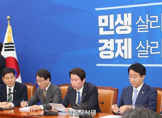 “민생을 살리는 국회, 경제를 살립니다” 16일 민주당 원내대표 회의실 걸린 백드롭이다. 이는 민주당 이인영 원내대표단의 국회 운영과 민주당이 앞으로 나아갈 방향을 제시한 것으로 읽힌다.