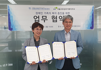 한국토지주택공사(이하 LH) 서울서부권주거복지지사(지사장 표원두)는 5월 20일 서울 장애인가족지원센터(센터장 김종옥)와 장애인 가족의 복지 증진을 위하여 상호 협력하는 업무협약(MOU)을 체결했다고 밝혔다. 이번 협약에 따라 양 기관은 주거복지 상담 · 교육 · 솔루션 등 서비스를 연계하여 장애인 가족의 주거 불편을 해소하고 맞춤형 복지 증진을 위해 상호 협력하게 된다. 표원두 주거복지지사장은 “이번 협약을 통해 상호 연계 및 협력 체계를 발전시켜 장애인 가족의 주거안정과 삶의 질적 향상을 위해 열심히 노력하겠다.”라고 전했다.