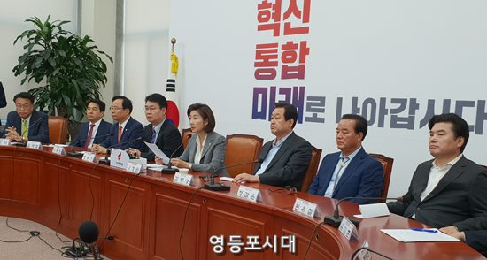 자유한국당 나경원 원내대표(사진 오른쪽에서 네번째)는 이날 회의에서 “의정부 일가족 사망 사건 소식, 일자리 감소, 최저임금 폭등 부작용, 국내기업의 해외투자 55조원” 등을 일일이 열거한 후 “소득주도성장에서 시장주도성장으로 성장 담론을 바꿔야 한다”고 주장했다.