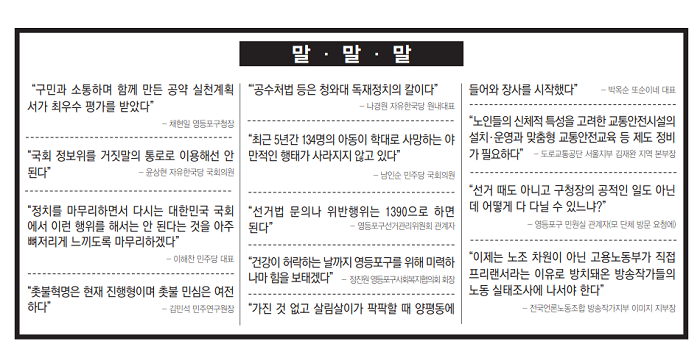 채현일 영등포구청장 “국회 정보위를 거짓말의 통로로 이용해선 안 된다.” 윤상현 자유한국당 국회의원 “정치를 마무리하면서 다시는 대한민국 국회에서 이런 행위를 해서는 안 된다는 것을 아주 뼈저리게 느끼도록 마무리하겠다.” 이해찬 민주당 대표 “촛불혁명은 현재 진형형이며 촛불 민심은 여전하다.” 김민석 민주연구원장 “공수처법 등은 청와대 독재정치의 칼이다.” 나경원 자유한국당 원내대표 “최근 5년간 134명의 아동이 학대로 사망하는 야만적인 행태가 사라지지 않고 있다.” 남인순 민주당 국회의원 “선거법 문의나 위반행위는 1390으로 하면 된다.” 영등포구선거관리위원회 관계자 “건강이 허락하는 날까지 영등포구를 위해 미력하나마 힘을 보태겠다” 정진원 영등포구사회복지협의회 회장 “가진 것 없고 살림살이가 팍팍할 때 양평동에 들어와 장사를 시작했다.” 박옥순 또순이네 대표 “노인들의 신체적 특성을 고려한 교통안전시설의 설치·운영과 맞춤형 교통안전교육 등 제도 정비가 필요하다” 도로교통공단 서울지부 김재완 지역 본부장은 “선거 때도 아니고 구청장의 공적인 일도 아닌데 어떻게 다 다닐 수 있느냐? 영등포구 민원실 관계자(모 단체 방문 요청에) “이제는 노조 차원이 아닌 고용노동부가 직접 프리랜서라는 이유로 방치돼온 방송작가들의 노동 실태조사에 나서야 한다” 전국언론노동조합 방송작가지부 이미지 지부장