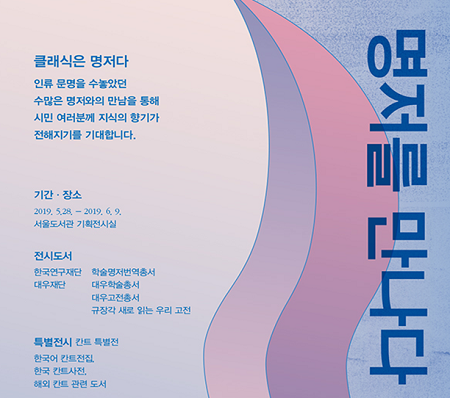서울도서관(관장 이정수)이 5월 28일(화)부터 6월 9일(일)까지 1층 기획전시실에서 개최하는 이번 <명저를 만나다> 기획 전시는 학술성과의 세대 간 전수와 대중적 확산을 목표로 한국연구재단에서 2001년부터 출간을 시작한 ‘학술명저번역’을 중심으로 31종, 171권의 명저를 전시한다. 문자가 발명된 이후 시대가 변화하고 역사가 흘러감에 따라 새로운 시대를 여는 의미 있는 책들이 끊임없이 출간되고 있다. 이번 전시는 인류의 역사와 함께 하며, 지난 20여 년간 다시 번역되어 계속해서 출판된 고전 명저를 소개하는 의미 있는 시간으로 기획되었다. 특히 임마누엘 칸트 『이성의 한계 안에서의 종교』, 스티븐 제이 굴드 『시간의 화살 시간의 순환』 등 독자들의 많은 사랑을 받은 '명저 베스트 10'을 선정해 소개하고 시민참여 이벤트도 진행한다. 또한, 한국연구재단의 ‘학술명저번역’ 외에도 전통과 권위를 자랑하는 ‘대우학술총서’와 ‘대우고전총서’ 등을 선보일 예정이며, 특별전시로 한국어 칸트전집과 해외 칸트 관련 도서를 한눈에 비교해볼 수 있는 칸트 특별전도 개최된다. 이번 전시는 한 권의 명저를 현대인들이 읽을 수 있도록 번역과 교열, 편집하는 전 과정을 알 수 있는 전시를 통해 통상 3~4년이 소요되는 명저의 재탄생 전 과정을 만나볼 수도 있다. 이정수 서울도서관장은 “많은 시민들이 이번 <명저를 만나다> 전시와 강연을 통해 고전 명작들을 만나 인류 역사에서 지식의 흐름 둘러보는 시간을 가져보기를 바란다.”라고 말했다.