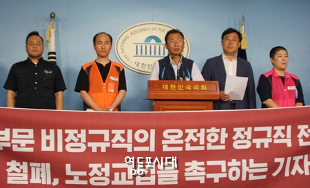 민주노총 공공부문 비정규직 공동파업위원회와 민중당 김종훈 국회의원(아래 민주노총위원회와 김종훈 의원)은 7월 1일 국회 정론관에서 기자회견을 열고 “문재인 대통령은 취임 후 인천공항을 찾아서 공공부문 비정규직 제로”를 선언하며 공공부문 비정규직 정규직화를 약속했다”며 “정부가 노∙정 교섭에 즉각 나설 것”을 촉구했다. 민주노총위원회와 김종훈 의원은 “차별과 불평등의 상징이 되어버린 비정규직 문제를 해결해나가겠다는 대통령의 의지에 모든 노동자가 박수를 보냈다”라면서 “그러나 취임 3년 차에 접어든 지금, 공공부문 비정규직 노동자의 현실은 암담하다”고 주장하고 “정규직 전환은 무기계약직이나 자회사 정규직 전환으로 둔갑하여 ‘가짜 정규직화’라는 비판을 피할 수 없다”고 비판했다. 민주노총위원회와 김종훈 의원은 “차별의 문제는 여전히 해소되지 않아서 같은 일을 하는 정규직의 5~60% 정도밖에 되지 않는 임금을 받으면서 온갖 갑질에 시달리고 있다”며 “이에 민주노총은 100만 공공부문 비정규직의 온전한 전환과 차별 철폐를 위해 끊임없이 정부와 대화와 교섭으로 해결하기 위해 노력해왔다”고 주장했다. 민주노총위원회와 김종훈 의원은 “그러나 노-정간 협의 구조를 만들자는 비정규직들의 호소에 정부는 아무런 대책은 물로 제대로 된 대답조차 없는 것이 현실이다”라며 “해가 갈수록 심해지는 정규직-비정규직의 격차 해소에 대책도 없고, 노동조합의 정당한 교섭 요구에 응답조차 제대로 하지 않는 정부를 향해 민주노총의 20만 공공 부분 비정규직 노동자들은 절규하는 심정으로 7월 3일부터 총파업에 돌입한다”고 밝혔다. 민주노총위원회와 김종훈 의원은 “기대가 큰 만큼 실망도 크다고 2년을 기다렸으면 참을 만큼 참았다는 것이 공공부문 비정규직 노동자들 대다 수의 마음이다”며 “정규직의 반값 임금을 받으면서 참아왔지만 더는 참을 수 없다는 비정규직 노동자들의 절규가 공공부문 비정규직 사상 최초의 연대 총파업을 성사시켰다”고 밝혀 총파업 돌입을 거듭 강조했다.