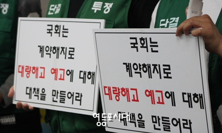 이날 기자회견장 안에서 일부 민주노총조합원들이 “국회는 계약해지로 대량해고 예고에 대해 대책을 만들라” 등의 손피켓을 들고 침묵시위를 벌였다.