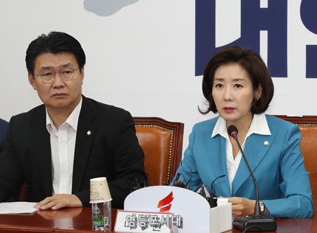 나경원 원내대표(사진 오른쪽)는 “윤석열 검찰총장 후보에 대해서는 어제 이미 말씀을 다 드렸다. 그 자리에서 내려오는 것이 검찰개혁의 길이고, 검찰의 명예를 지키는 길이라는 말씀을 다시 한번 드린다”며 윤 후보자의 자진 사퇴를 촉구했다.