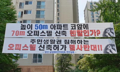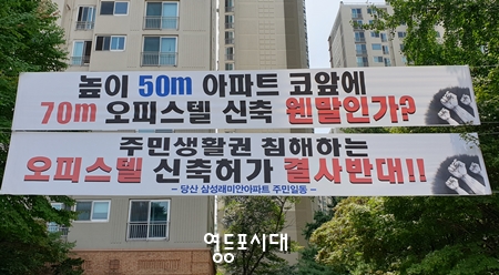 1,391세대 당산 삼성래미안아파트 주민들은 그동안 당산동 5가에 추진 중인 오피스텔 신축허가를 반대하며 영등포구청에 ▲사생활 보호 ▲주민들의 건강 보호 ▲현재 19층의 아파트보다 4층이 낮은 15층으로 신축예정인 오피스텔 높이가 20m가 더 높은 70m인 점 ▲현재 3면이 고층건물로 둘러싸여 있고 유일하게 트인 북단까지 꽉 막히는 점 등을 주장하며 “70m 높이의 15층 오피스텔 신축허가를 불허해 줄 것”을 영등포구청에 요구해 왔다.