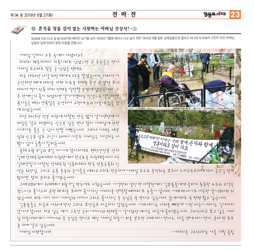 차라리 재혼하셔서 가족이라도 있었으면 그 후손들을 만나 아버님 묘소라도 찾을 수 있었을 텐데요. 저는 1950년 12살 되던 해에 6.25를 맞았습니다. 나라가 어수선하던 때에 다리를 다쳐 치료를 3개월 동안 못 받다 보니 다리가 썩어 왼쪽 다리 전체를 절단할 수밖에 없었습니다. 그 후 장애인의 몸이 되었지만 살아야겠다는 신념으로 열심히 양복기술을 배워 양복점을 운영하여 고향에 논과 서울에 집을 갖게 되었습니다 지난 2013년 정부 지원에 사할린 땅을 밟아 살아생전에 아버님을 알고 지냈다는 신구봉 님을 만나 잠시 아버님에 관한 이야기를 들을 수 있어 정말 기뻤습니다. 그러나 이제는 대부님과 신구봉 님도 고인이 되셔서 아무도 아버님은 기억하는 사람이 없어 슬픔이 밀려옵니다. 올해 6월 4일과 8일 사이에 감사하게도 행정안전부 산하 일제 강제동원피해자 지원단에서 항공료를 지원해주셔서 사)일제강점기 사할린 강제동원 억류피해자 한국 잔류유족회 신영순 회장님, 그리고 유족 후손과 큰아들을 데리고 2차로 방문하여 아버님 묘소로 추정되는 보르나 스키공동묘지에 가서 온종일 찾아봤지만, 찾지 못하고 돌아왔습니다. 그때 KBS에서 취재해서 8월 9일 방송에도 나왔습니다. 이역만리 낯선 땅 사할린에서 일본놈들에게 끌려가 혹독한 노동과 고역을 겪으시고 돌아오지 못한 채 피를 토하며 돌아가신 아버지를 생각할 때마다 또 눈물이 납니다. 이제 제 나이도 여든한 살이(81세) 되었습니다. 저도 어서 가서 아버님과 어머니 그리고 돌아가신 두 누님을 꼭 만나고 싶습니다. 꿈에서라도 꼭 한번 뵙고 싶습니다. 일본놈들은 지금도 사죄에 반성 그리고 보상금도 지급하지 않았습니다. 이제 다시는 나라를 빼앗겨 이런 비극이 다시는 일어나지 않아야 합니다. 하고 싶은 얘기 그동안 우리 어머니와 형제들이 살아왔던 얘기는 다음에 올리겠습니다. 그리워지고 보고 싶은 아버님 하늘나라에서 어머니와 두 누님을 만나고 계신 아버님 하늘이 저를 부르면 그때 다시 만나요. 다음 생에 다시 만나, 못다 한 효도를 하며 살고 싶습니다. 아버님 사랑합니다. 아버지를 그리워하는 아들 기필 올림