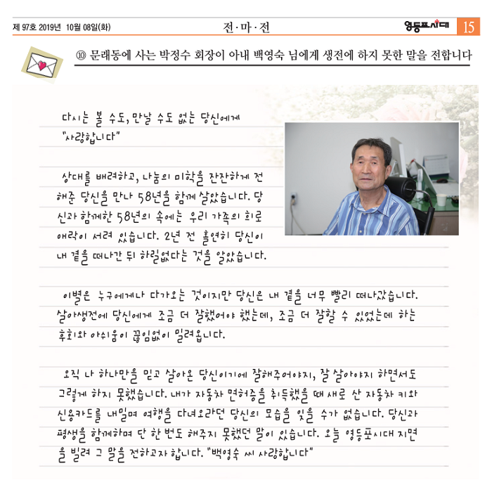상대를 배려하고, 나눔의 미학을 잔잔하게 전해준 당신을 만나 58년을 함께 살았습니다. 당신과 함께한 58년의 속에는 우리 가족의 희로애락이 서려 있습니다. 2년 전 홀연히 당신이 내 곁을 떠나간 뒤 하릴없다는 것을 알았습니다. 이별은 누구에게나 다가오는 것이지만 당신은 내 곁을 너무 빨리 떠나갔습니다. 살아생전에 당신에게 조금 더 잘했어야 했는데, 조금 더 잘할 수 있었는데 하는 후회와 아쉬움이 끊임없이 밀려옵니다. 오직 나 하나만을 믿고 살아온 당신이기에 잘해주어야지, 잘 살아야지 하면서도 그렇게 하지 못했습니다. 내가 자동차 면허증을 취득했을 때 새로 산 자동차 키와 신용카드를 내밀며 여행을 다녀오라던 당신의 모습을 잊을 수가 없습니다. 당신과 평생을 함께하며 단 한 번도 해주지 못했던 말이 있습니다. 오늘 영등포시대 지면을 빌려 그 말을 전하고자 합니다. “백영숙 씨 사랑합니다”