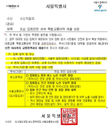 아래는 여명 시의원이 박원순 서울시장에게 보낸 공개서한 전문이다. 아 래 박원순 시장님! 서울시민 모두의 시장이 되어주세요 시장님, 오늘도 서울시정에 노고가 많으십니다. 정치란, 특히 지방정부의 정치란 사람을 향하는 것이어야 한다는 점에서 우리 서울시민들을 향한 시장님의 살뜰한 관심이 녹아나는 정책들을 보며 많이 배우고 있습니다. 시장님, 조국 장관 발 시국이 시민들을 둘로 나누고, 광장을 둘로 쪼개고 있습니다. 시장님이 자주 뿌듯해 하셨듯 광장민주주의·직접민주주의란 방식에 이젠 더 많은 시민들이 익숙해지고, 또 의견을 표출하는데 적극적이 되었습니다. 한 가지 우려스러운 것은 광장에서 나오는 목소리를 대하는 시장님과 서울시의 태도입니다. 최근 여러 언론보도에서 시장님이 지난 3일 광화문의 조국 규탄집회에는 화장실을 설치하지 않았고, 5일 서초동 조국 수호 집회에는 화장실을 무려 20개를 설치하고 막차 시간까지 늘려준 것으로 드러났습니다. 시장님이 그렇게 유치한 잣대로 서울시민을 대하진 않았을 듯 하고, 어제 오전 한 인터뷰에서도 ‘서울시민에 보수와 진보가 어딨나. 10월 3일 집회에 대해서도 똑같이 지시했다’ 라고 하셨기에 관할 부서인 서울시 교통정책과에 문의를 해봤습니다. 문의 결과 "최근 대규모 집회와 시위가 예정된 부분이 있으니 간이화장실 설치 등을 포함한 대책에 대해 검토" 하라는 내용의 공문이 한 개 존재하더군요. 그렇다면 서울교통공사가 자체 판단으로 조국 규탄집회에는 화장실을 설치하지 않고, 조국 수호 집회에만 화장실을 20개 설치하고 또 막차 시간까지 조정한 것인지 감사 기관의 한사람으로서 놀라지 않을 수 없었습니다. 엄중히 문책하셔야 할 사안입니다. 서울교통공사의 오버로 인해 조국 수호 집회가 서울시의 관제데모라는 오명까지 받고 있는 것 아니겠습니까? ‘광화문에는 개방형 화장실이 많다’ 는 이야기를 하십니다. 그러나 그 개방형 화장실들이 어디에 위치해 있는지 시청 관계자와 관공서 공무원들 아니면 알기 힘든 정보입니다. 교통공사가 시장님의 지시를 잘 이행하고자 했었으면 최소한 개방형 화장실이 어디 어디 있는지 임시 표지판을 만들어놨을 것입니다. 이것은 공무원의 직무유기이기도 합니다. 그런데 한편 공문을 자세히 살펴보니, 서울시에서 버스정책과와 교통공사에 공문을 내릴 때 “광화문 광장 2만 8000여 명, 서초동 100만 명” 으로 예상인원을 하달하였습니다. 이 인원수가 교통공사에서 ‘광화문광장에는 인원이 적고 서초동에는 많으니 이동식 화장실은 서초동에만 설치하는 것이 맞겠지’ 라는 오판을 내리게 했을 것이라는 의문을 지울 수 없는 것이 사실입니다. 광화문과 서초동 집회의 인원 예상은 누가 한 것인지 역시 문책 대상입니다. 한 가지 더 있습니다. 시장님은 조국 규탄집회에 참가한 일부 시민들이 사적에 들어갔다는 이유로 폭력·불법을 말씀하시며 강력한 조치를 취하겠다고 하셨습니다. 그러나 정작 시장님은 일부 종북 성향 대학생들이 세종대왕동상을 밟고 올라가 기습 점거 시위를 벌일 때는 늘 조용하셨습니다. 시장님, 서울시민에 보수와 진보가 어딨냐는 말씀에 감동 받았습니다. 또한 광화문에 쏟아져 나온 수십만의 시민들이 보수로 보이지도 않습니다. 광장에서 나오는 목소리가 무엇이건 간에 시장님이 서울의 행정수장으로서 오직 시민만 생각할 때, 시장님이 말씀하신 다양한 의견과 목소리가 조율되는 민주사회가 도래할 것이라고 믿어 의심치 않습니다. 2019. 10. 8. 서울시의원 여명