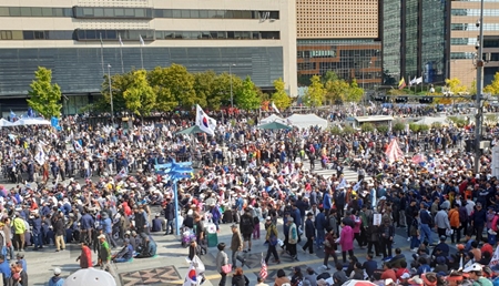 자유한국당은 19일 오후 광화문 세종문화회관 앞에서 “국민의 명령! 국정대전환 촉구 국민보고대회”를 열고 “조국 前 민정수석은 우리가 사퇴시켰다”라며 “‘광화문 10월 항쟁’은 승리했다”라고 주장했다.