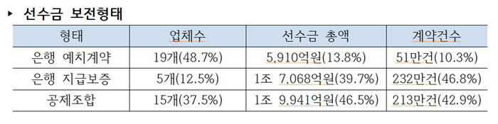 서울시가 발표한 결과에 따르면 올해 초 자본금 등록요건이 강화된 할부거래법이 시행됨에 따라 요건에 미달한 상조업체들이 무더기로 직권 말소되었음에도 불구하고 상조업계는 꾸준한 성장세를 보이는 것으로 나타났다. 먼저 상조업체 현황을 살펴보면, 지난 6월 말 기준 서울시에 등록된 상조업체의 수는 총 40개로 지난해 12월 말(59개)보다 19개 업체가 줄었으나, 선수금 규모는 4조 2,919억원으로 8.3%(3,301억원) 증가했다고 밝혔다. 계약 건수도 24만 건(5%) 늘어난 496만 건이었다. 업체 수가 감소한 이유는 지난 1월 자본금 등록요건이 15억 원으로 강화된 개정 할부거래법 시행으로 자본금 요건을 충족하지 못한 업체들이 직권말소 처분되었기 때문이다. 현재 전국 상조업체는 86개로 그중 47%가 서울시에 소재하고 있다. 그리고 전체 선수금 및 계약 건 수의 90% 이상은 자산규모 500억원 이상인 대형업체에 집중되어 있어 상조 시장의 양극화 현상도 지속하고 있는 것으로 나타났다. 이는 자본금 등록요건 강화로 인해 영세 중소업체가 구조조정이 되고 대형업체들의 결합상품 등 판매로 선수금이 대형업체로 집중되었기 때문이다. 이들 상조업체는 선수금의 50%를 공제조합이나 은행 등을 통해 보전하고 있는데, ▲은행 예치 20개 업체(50%) ▲은행지급보증 5개 업체(12.5%) ▲공제조합(한국상조공제조합, 상조보증공제조합) 계약체결 15개 업체(37.5%)였다. 특히 은행과 지급보증을 맺은 업체는 주로 대형업체들로 5개에 불과하지만, 선수금 규모는 전체 업체 선수금의 39.8%인 1조 7,068억원에 달했다. 현행 할부거래법상 상조업체의 폐업·등록취소 등으로 인한 소비자 피해를 막기 위해 은행 예치 및 지급보증, 공제계약 등의 방식으로 선수금의 50%를 보전하고 있다.