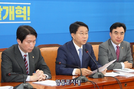 이인영 원내대표는 이어 “혁신적 포용 국가와 한반도 평화를 향한 대여정에서 경제 사회의 수준을 질적으로 높여왔고 사회 안전망 강화와 혁신 성장의 기반 조성, 평화와 균형외교를 위한 노력을 높이 평가한다”면서도 “그러나 국민들께서 성과를 체감하시기에 아직 부족할 것이다. 후반기에는 피부에 와 닿는 성과를 내는데 집중할 것으로 기대하며, 민주당도 일심동체의 자세로 함께 뛰겠다”고 밝혔다. 자유한국당 황교안 대표가 6일 기자간담회에서 밝힌 “자유 우파 통합” 제안에 대해서는 “장병 갑질 장군 영입에 대한 책임 추궁을 피하려고 묻지 마 보수 통합’을 제안하고 나선 것으로 보인다”고 평가 절하하고 “최소한의 교감이나 소통도 생략한 일방통행식 뚱딴지 제안이었다”고 비판했다. 이 원내대표는 “선거를 다섯 달 앞두고 이제 실현 가능성 낮은 정계개편에 매달리는 제1야당의 행보가 참으로 딱해 보인다”며 “황교안 대표는 국민의 질문에 대답부터 해야 한다. 국민은 왜 박찬주 같은 구시대 인사를 영입 1호로 하고자 했는지 묻고 있다”며 “삼청교육대 망언에 대한 입장도 분명히 하시길 거듭 요구한다”고 밝혔다. 이인영 원내대표는 국회 일정이 강기정 청와대 정무수석으로 인해 멈춰 선 것에 대해 “강기정 수석을 두둔하려는 것은 아니지만, 애초에 피감기관을 피의자 다루듯 한 문제가 문제라면 문제다”며 “공직자들을 검사가 피의자 다루듯 행세한 자유한국당도 잘한 일은 아니다. “백번 제 잘못”이라는 사과를 거듭 뿌리치는 모습은 과도해 보인다”고 비판했다. 이 원내대표는 “더는 정쟁으로 허비할 시간이 없다”며 “올해 자유한국당은 끊임없이 조건 바꿔 달기로 추경을 발목 잡아 100일을 허비했다. 그 여파가 성장률에 최소한 –0.2%의 영향을 미쳤다고 전문가들은 분석한다”고 주장하고 “더는 우리 국민이 손해를 보지 않도록 예산심사에 속도를 내고 집중하자”고 강조했다. 이인영 원내대표는 정부가 6일 발표한 서울 강남 등 분양가상한제 적용 지역과 관련 “과거 버블세븐 지역을 특별 관리했던 것처럼 집값 불안의 불씨 지역을 정밀하게 선정해 시장 불안을 최소화하기 위한 것으로 보인다”고 평가하고 “지난해 9.13 부동산 조치 이후 주택가격은 안정세를 이어갔지만, 최근 강남 4구를 중심으로 집값 상승 조짐이 나타나고 있다”며 “치솟는 집값을 잡겠다는 정부•여당의 의지는 확고하다”는 점을 강조했다. 조정식 정책위의장 6일 자유한국당이 강기정 수석의 예결위 출석을 문제 삼으며 예산심사 일정을 보이콧 한 것과 관련 “자유한국당의 몹쓸 고질병이 또다시 재발했다”고 일침을 가하고 “이 때문에 어제 예정됐던 비경제부처 29개 기관에 대한 부별 예산심사가 정상적으로 진행되지 못했다. 참으로 어처구니없는 행태가 아닐 수 없다”고 비판했다. 조 정책위의장은 “관련 사안에 대해서는 강기정 수석이 이미 여러 차례 유감을 표명했다”고 밝히고 “더욱이 운영위 국감 파행을 핑계로 예산 심사 일정을 발목 잡는 것은 대단히 몰상식한 처사다. 셀프 표창장 남발과 인재영입 참사는 당내 갈등과 비난을 회피하기 위한 무리한 정치 공세로밖에 볼 수 없다”고 주장했다. 조정식 정책위의장은 “대내외 경제 환경이 매우 엄중한 상황이다”고 지적하고 “예산심사를 볼모로 치졸하고 한가한 정치 투정을 부릴 여유가 조금도 없다. 자유한국당은 예산심사가 정상적으로 진행될 수 있도록 적극적으로 협조해야 한다”며 “자유한국당의 책임 있는 자세를 강력하게” 요구했다.