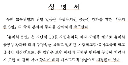 서울시의회 교육위원회가 사립유치원 공공성 강화를 위한 ‘유치원 3법’의 국회 본회의 통과를 촉구하고 나섰다. 서울시의회 교육위원회 위원 일동은 28일 발표한 성명서를 통해 ‘유치원 3법’은 1년 동안 국회 교육위와 법사위에서 한 차례의 논의도 이루어지지 못한 채 결국 지난 9월 24일 본회의로 자동 회부되었다”며 이같이 촉구했다. ‘유치원 3법’은 지난해 10월 사립유치원 비리 사태를 계기로 유치원 공공성 강화와 회계 투명성을 목표로 발의된 ‘사립학교법·유아교육법·학교급식법 개정안’으로, 보수 야당의 극렬한 반대에 부딪혀 처리되지 못한 채 결국 여야 합의에 따라 패스트트랙 법안으로 지정된 바 있다. 이와 같은 상황에서 사립유치원 측은 여전히 ‘유치원 3법’의 부당함을 주장하며 교육부 장관을 상대로 ‘사학기관 재무·회계 규칙 제53조의3이 사립유치원의 회계 관리에 지정정보처리장치(에듀파인)를 사용하도록 규정한 것은 무효’라고 주장하며 법원에 행정소송을 제기했다. 이러한 상황에서 동 법안들은 본회의 60일 이내에 상정되지 않으면 이 기간이 지난 후 처음 열리는 본회의에 자동 상정돼 표결 처리되는바, 그 첫 본회의는 오는 11월 29일(금) 예정된 상황이다. 서울시의회 교육위원회 일동은 “결국 1년여 동안 사회적 논란이 되었던 ‘유치원 3법’의 운명은 11월 29일 국회 본회의 표결로 결정될 운명에 놓이게 되었다”며 “본회의 표결을 앞두고 국회에서는 한유총이 ‘시설사용료 지급’ 등을 요구하며 법안 수정을 요구하고 있고, 학부모들은 이러한 논의가 아이들을 정쟁의 대상으로 만들고 있다고 분노하고 있다”고 강조했다. 서울시의회 교육위원회 “‘유치원 3법’의 국회 본회의 통과 여부는 결코 사립유치원들의 집단적 이해관계에 따른 거래의 대상이 될 수 없고, 이는 오로지 유아교육의 공공성 확보라는 국가의 책무성 확인과 유아 단계에서부터 국가적 인재 양성을 위한 교육적 기반을 다져야 한다는 역사적 소명의식에 따라 결정되어야 하는 당위적인 사항이다”며 “따라서 국회는 「유치원 3법」의 개정이 사립유치원의 공공성 확보와 더불어 유아교육의 국가 책무성 강화를 위한 초석이라는 점을 명심해야 할 것이다”고 강조했다. 서울시의회 교육위원회 일동은 “사립유치원 공공성 확보를 위해서 ‘유치원 3법’이 조속히 해결될 수 있도록 ”국회는 유치원 3법을 조속히 처리하여 유아교육의 국가 책무성을 확보할 것, 사립유치원은 유아교육 책임지는 교육기관으로서 책무성을 갖고 유치원 3법을 수용할 것“을 촉구했다.