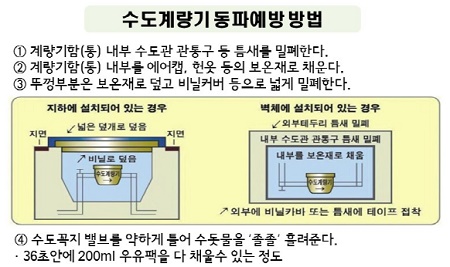 또, 노출 수도관, 화장실 및 보일러 등은 보온재 등으로 노출 부위를 감싸 외부 찬 공기로부터 보호하고 일 최저기온 –10℃~-15℃를 초과할 때는 보온조치를 하였더라도 욕조의 수도꼭지를 아주 조금씩 흐를 정도로 개방해야 동파를 예방할 수 있다. 특히 영하 10℃ 미만으로 떨어지는 날 장시간 외출 등으로 물을 사용하지 않을 경우 발생하는 동파를 예방하기 위해서는 수도 밸브를 조금 열어 수돗물 흐르게 하는 것이 좋다. 서울시가 동파에 취약한 38만여 세대에 대한 주택 유형별 맞춤형 보온조치를 강화하고, 동파 발생 시 신속한 복구를 위해 내년 3월 15일까지 ‘겨울철 급수대책 상황실’을 운영한다. 서울시가 지난겨울에 동파가 발생한 세대를 분석한 결과, 복도식 아파트의 벽체형 계량기함과 소규모 상가의 맨홀형 계량기함에 설치된 수도계량기에서 동파가 많이 발생하였으며 주요 원인은 보온 미비가 가장 많았던 것으로 분석됐다. 특히 관리인이 없는 연립주택의 경우 계량기함의 뚜껑이 파손되거나 보온재를 꽉 채워 넣지 않아 차가운 공기가 계량기함 안으로 유입되어 맨홀형뿐만 아니라 벽체형 계량기함에 설치된 수도계량기에서 동파가 많이 발생한 것으로 나타났다. 또한, 수도계량기 보온을 하였어도 영하 10℃ 미만인 날이 연속일 때 동파가 많이 발생하다가 기온이 영하 15℃ 미만으로 떨어지면 동파 발생량이 급증했다. 이에 따라, 시는 노후된 연립주택과 복도식 아파트를 대상으로 벽체형 보온재 1만 5천 개를 설치하였고 단독주택과 상가에는 맨홀형 보온재 3천 8백 개를 설치하였으며 파손된 계량기함 뚜껑 6천 2백 개를 정비하였다 또한, 계량기함 내 보온이 미흡하여 수도계량기 동파가 발생한 세대는 계량기 교체 시 계량기 자체 보온재와 보온덮개 또는 동파 안전계량기를 설치하여 동파가 재발하는 것을 예방할 계획이다 시는 이런 동파 예방 조치와 함께 일 최저기온에 따라 ‘관심 ‣주의 ‣경계 ‣심각’ 등 4단계의 동파 예보 제를 실시하고, 8개 수도사업소별 관할 지역의 공동주택 관리소장과 공사현장 관계자의 연락처를 확보하여 최저기온이–10℃ 미만으로 내려가 동파가 우려될 경우 동파 예보 문자를 발송할 계획이다. 서울시 관계자는 “서울시는 11월 15일부터 내년 3월 15일까지 4개월간 겨울철 시민 생활 안전 급수대책 상황실을 운영하는 등 겨울철에 수도계량기 동파가 발생했을 때 이를 신속하게 복구하기 위한 체계를 갖추었고 노출된 송·배수관 점검을 완료한 상태다”라고 전했다. 서울시 관계자는 이어 “수돗물이 갑자기 나오지 않을 때는 수도계량기 유리가 깨지거나 부풀어 올랐는지 확인하여 동파가 의심될 때는 서울시 다산콜센터(120번) 또는 담당 수도사업소로 신고할 것”을 당부했다.