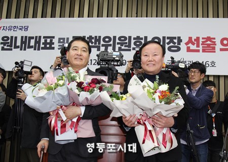 자유한국당은 9일 오전 국회에서 원내대표 및 정책위의장 선출을 위한 의원총회를 열고 원내대표에 심재철(사진 왼쪽), 정책위의장에 김재원 의원을 선출했다.