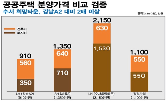 서울시 강남구 수서동 신혼희망타운의 분양가가 적정분양가의 두 배에 이르는 것으로 나타났다.