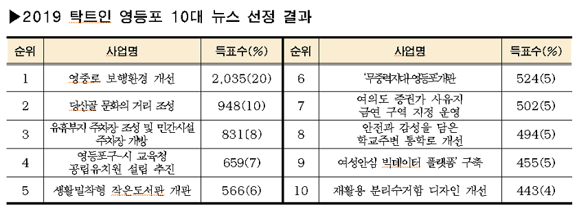 영등포구는 교육․문화, 경제․도시, 생활․환경, 복지․건강, 민주․행정의 5개 분야 20개 주요 정책을 놓고 12월 11일부터 20일까지 10일 동안 구 홈페이지를 통해 진행했으며 구민 총 3,602명이 참여해 1명당 3건씩 투표했다. 이중 영등포역 앞 노점상 철거 및 보행로 개선이 2,035표(20%)를 받아 압도적인 1위를 차지했다.‘영중로 보행환경 개선’ 사업은 50년 동안 거리를 점유했던 불법 노점상 58개소를 거리가게 26개로 새롭게 정비하고, 보도블록 교체, 버스정류장 통․폐합 등으로 쾌적하고 깨끗한 거리로 조성한 사업이다. 이어 2위로는 ‘당산골 문화의 거리 조성’(948표, 10%), 이어 ‘유휴부지 주차장 조성 및 민간시설 주차장 개방’(831표, 8%)이 3위에 올랐다. 4위는 영등포구-시 교육청 공립 유치원 설립(659표, 7%), 5위 생활밀착형 작은 도서관 개관(566표, 6%)이 나란히 10대 뉴스 상위권에 올랐다.