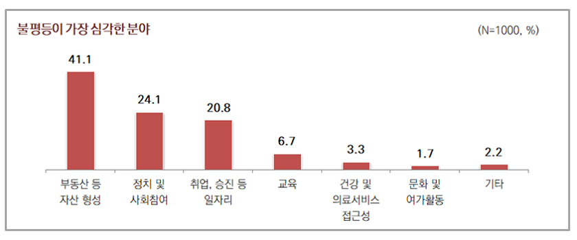 불평등이 가장 심각한 분야로는 부동산 등 자산형성(41.1%)을 가장 많이 꼽았다. 정치 및 사회참여(24.1%), 취업·승진 등 일자리(20.8%) 분야가 뒤를 이었다.