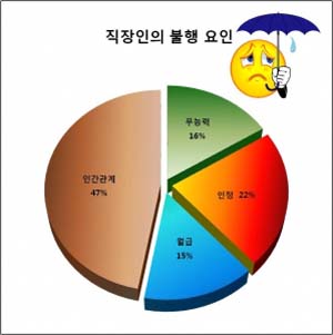 전자세금계산서 사이트로 100만 직장인 회원을 보유한 비즈니스온커뮤니케이션의 스마트빌(www.smartbill.co.kr)이 지난 12월 1,333명을 대상으로 직장인의 불행하게 되는 이유를 설문조사했다. 이번 조사에서 직장인 47%가 직장생활에서 불행하게 생각되는 이유로 직장 내 어려운 인간관계를 꼽았다. 그 밖에 열심히 일해도 인정받지 못하는 것 22%, 업무 능력 부족 16%, 쥐꼬리 같은 월급이 14%으로 나타났다. 이에 대한 결과로, 직장인으로서 행복하기 위해 필요한 가장 중요한 요인으로 직장 내 좋은 인간관계를 유지하는 것이라고 답한 직장인이 41%였다. 자신의 능력을 인정받는 것이라는 답변이 29%, 수입 20%, 적합한 업무 제시가 8%로 각각 나타났다. 이처럼 직장인들은 직장 내 능력, 급여보다 인간관계가 행복에 가장 큰 영향을 준다고 생각하는 것으로 나타났다. 또한, 직장인으로서 행복해지기 위해 업무능력 개발을 한다는 답변이 58%로 가장 많았고, 조직 문화 적응이 20%, 가족에 충실하다는 답변이 16%, 재테크 등 돈 모으기가 4%로 뒤를 이었다. 이는 직장인들이 직장 내 인간관계를 행복의 중요한 요인으로 뽑으면서도 실제로는 업무 능력 개발에 더욱 치중하고 있는 것으로 보여진다. 한편, 행복의 빈도를 묻는 질문에서는 가끔 행복하다는 직장인이 57%로 가장 많았고, 항상 행복하다는 직장인이 14%, 거의 행복하지 않는다는 직장인이 27%, 아예 행복하지 않다고 생각하는 직장인은 0%로 직장인 71%가 삶에서 행복을 느끼는 것으로 조사됐다.