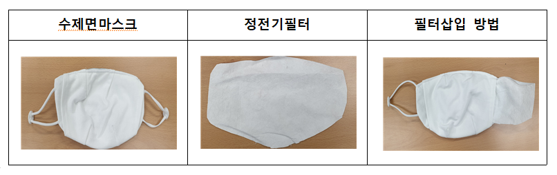 비말의 크기는 직경 5㎛이상, 비말핵은 직경 1~4㎛의 입자로 알려져 있다. ‘KF’는 ‘Korea Filter’의 약자로 식품의약품안전처가 보건용 마스크의 성능을 인증하는 마크이다. 반면, 시중의 일반 면 마스크나 정전기필터를 제거한 수제 필터 면마스크의 경우 비말입자차단율이 16%~22%로 보건용 마스크 보다 성능이 떨어지는 것으로 확인됐다. 이중으로 되어 있는 마스크의 앞면과 뒷면 사이에 필터를 삽입하여 검사했다. 또한, 마스크 크기에 맞게 새 필터로 교체 시 세탁 전, 후의 비말입자차단효과가 비슷하여 재사용도 가능하다. 기존 시판중인 일회용 보건용 마스크와 달리 계속 사용할 수 있어 마스크 품귀현상에 대한 대안이 될 것으로 보인다. 연구원은 “일반 면 마스크도 큰 사이즈(3㎛이상)의 비말을 차단하는 효과는 있을 것으로 판단되나, 보다 완벽한 차단효과를 위해서는 정전기필터를 부착하여 사용할 것을 권장한다.”라고 말했다.