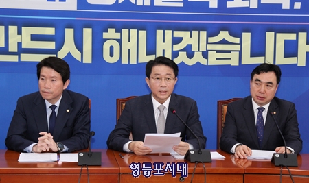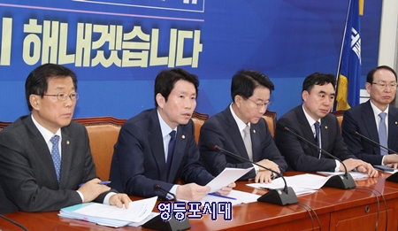 이인영 민주당 원내대표(사진 왼쪽에서 두 번째)는 5일 오전 국회에서 정책조정회의 모두 발언을 통해 코로나19를 극복하기 위해 벌어지고 있는 국민 운동을 상세히 소개하고 “민주당도 맡은 소임에 최선을 다하겠다”고 말했다.