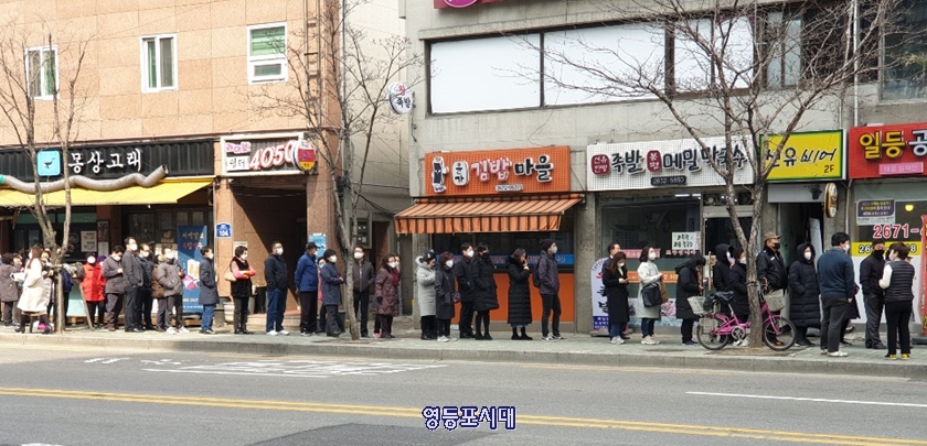 마스크 구매가 지역에 따라 약간의 차이는 있지만, 아직 원만하지 못한 것으로 나타났다. 6일 오후 주민들이 양평2동 약국에서 판매하는 마스크를 구매하기 위해 도로변에 길게 줄을 서 있다.