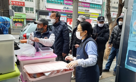 영등포구사회복지협의회(회장 정진원)가 운영하는 영등포 사랑나눔푸드뱅크마켓은 17일 무료급식소인 토마스의집에서 취약 계층인 500여 명과 무료급식소를 대상으로 점심 식사 대용 단판죽 등 나눔 행사를 가졌다.
