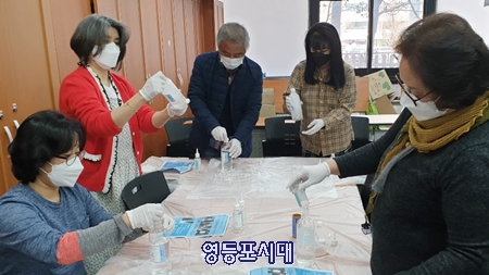 18일 영등포자원봉사센터 교육실에 모인 자원봉사자 일동이 ''2020 봉사단체 간담회''를 마친 후 준비된 재료를 이용해 DIY 소독제(젤형)를 만들고 있다.
