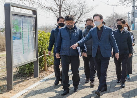 모로나19로 인해 ‘2020 영등포 봄꽃축제’는 취소되었지만, 구민의 안전은 지킨다. 채현일 영등포구청장은 23일 여의나루역을 방문해 주변 시설물을 점검하며 주민 안전을 챙기고 있다.