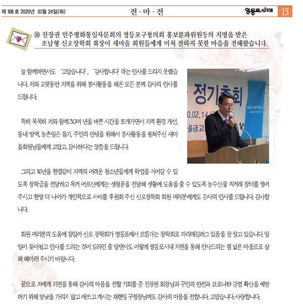 늘 함께하면서도 ‘고맙습니다’, ‘감사합니다’라는 인사를 드리지 못했습니다. 저와 오랫동안 지역을 위해 봉사활동을 해온 모든 분께 감사의 인사를 드립니다. 특히 묵묵히 저와 함께 30여 년을 바쁜 시간을 쪼개가면서 지역 환경 개선, 동네 방역, 농촌일손 돕기, 주민의 안녕을 위해서 봉사활동을 펼쳐주신 새마을회원님들에게 고맙고, 감사하다는 말씀을 드립니다. 그리고 16년을 한결같이 지역의 어려운 청소년들에게 학업을 이어갈 수 있도록 장학금을 전달하고 독거 어르신에게는 생필품을 전달해 생활에 도움을 줄 수 있도록 농수산물 직거래 장터를 열어주시고 한발 더 나아가 개인적으로 사비를 후원회 주신 신오장학회 회원 여러분에게도 감사의 인사를 드립니다. 감사합니다. 회원 여러분의 도움에 힘입어 신오 장학회가 영등포에서 으뜸가는 장학회로 자리매김하고 있음을 잘 알고 있습니다. 일일이 찾아뵙고 인사를 드리는 것이 도리인 줄 알면서도 이렇게 영등포시대 지면을 통해 인사드리는 점 넓은 마음으로 살펴 헤아려 주시기 바랍니다. 끝으로 저에게 지면을 통해 감사의 마음을 전할 기회를 준 진장권 회장님과 구민의 안전과 코로나19 감염 확산을 예방하기 위해 밤낮을 가리지 않고 애쓰고 계시는 채현일 구청장님께도 감사의 마음을 전합니다. 고맙습니다. 사랑합니다.