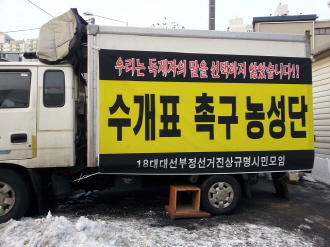 18대대선부정선거진상규명시민모임은 영등포 민주당사 앞에서 농성을 벌이고 있으며 밤에는 촛불집회를 진행하고 있다.