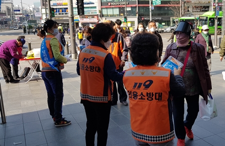 영등포구 지역 내 단체들의 마스크 나눔 행사가 릴레이로 이어지고 있는 가운데 영등포소방서 의용소방대가 마스크 나눔 행사 나섰다.
