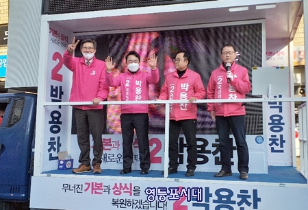 미래통합당 박형준 공동선대위원장(사진 왼쪽)이 4일 오후 신풍역 근처에서 4∙15총선에 출마한 영등포을 박용찬 후보(사진 왼쪽에서 두 번째) 지원 유세에 나서 손을 흔들며 박용찬 후보의 지지를 호소하고 있다.