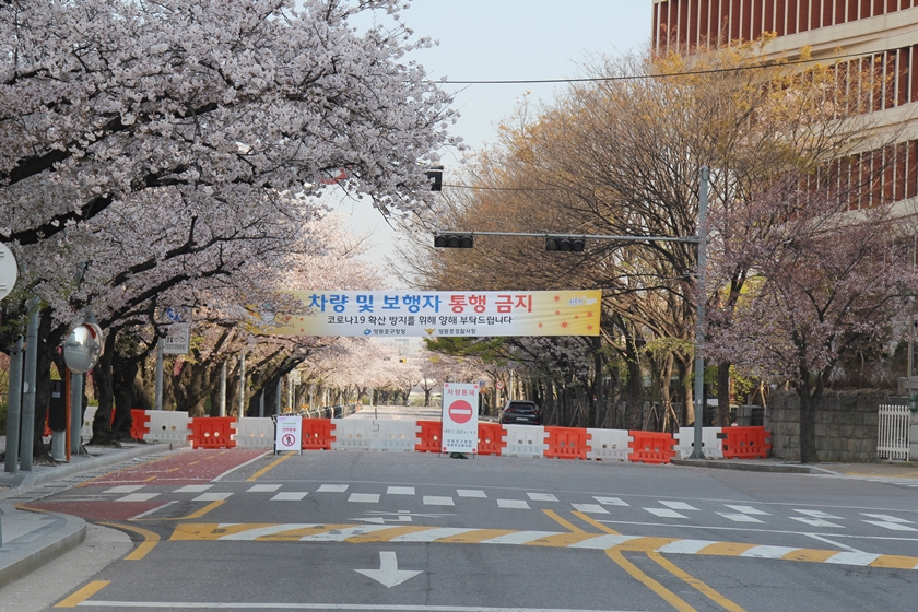 영등포구, 코로나19 감염확산 방지를 위한 특별 조치 9일 오전 11시 ‘2020 영등포 여의도 봄꽃축제’가 취소된 국회의사당 뒤쪽에 차량과 보행자 통행 금지를 알리는 현수막과 차단막이 처져있다. 오른쪽에는 새로 신축한 국회 소통관이 보인다.
