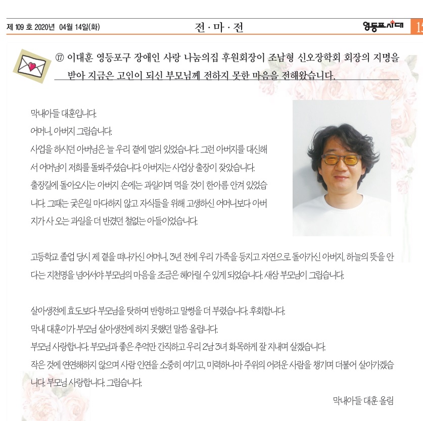 전·마·전 이대훈 영등포구 장애인 사랑 나눔의집 후원회장이 조남형 신오장학회 회장의 지명을 받아 지금은 고인이 되신 부모님께 전하지 못한 마음을 전해왔습니다