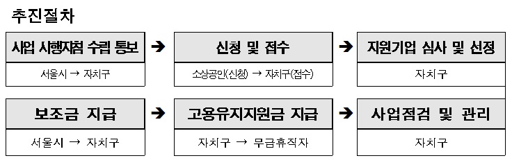 ‘서울형 고용유지지원금’은 소상공인 사업체의 주소지가 있는 관할 자치구에 신청하면 된다. 자치구 접수부터 고용유지지원금 지급까지의 시간을 최대한 단축하고자 자치구별로 행정지원인력을 4명씩 배치되어 지원 중이다. 고용유지지원금은 접수한 관할 자치구에서 지원 대상 근로자 통장으로 바로 입금한다.