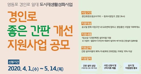 간판으로 개선함으로써 쾌적한 도시경관을 조성하고 지역경제 활성화를 도모하자는 것이 본 사업의 취지다. 영등포구(구청장 채현일)가 경인로 도시재생 활성화를 위한 ‘경인로 좋은 간판 개선 지원사업’ 공모에 나서, 간판 개선을 희망하는 업체에 보조금을 지원한다. 이는 쾌적한 도시경관을 조성하고 지역경제 활성화를 도모하기 위한 사업이다. 사업 실시 구간은 도림교사거리에서 청과시장 입구까지 약 2km 구간으로 도로변에 접한 가게들이 지원 대상이다. 한 가게당 1개 간판(벽면)에 한해 간판 설치비의 90% 이내(최대 250만원)에서 보조금을 지원하며, 총 비용의 10% 이상은 자부담해야 한다. 간판을 개선하려는 업체는 직접 신청하는 대신 지역 내 옥외광고업체에 대행 신청을 의뢰해야 한다. 대행 신청은 옥외광고업체 1곳당 5개 사업장에 한한다. 신청 기간은 5월 14일까지다. 기간 중 신청 대행을 맡은 옥외광고업체가 구 홈페이지에 게재된 신청서 및 구비 서류를 갖춰, 구청 도시재생과로 직접 방문하거나 이메일(yoni91@ydp.go.kr)로 접수하면 된다. 접수 마감 후, 구는 옥외광고심의위원회와 보조금심의위원회의 심의를 거쳐 100여 곳의 가게를 최종 선정한다. 구는 ‘서울좋은간판’ 사이트(https://goodsign.seoul.go.kr/)의 간판 공모전 수상작 디자인을 적용할 경우 가산점을 부여할 방침이며 간판의 노후 정도, 주변 환경과의 조화, 가독성 및 시인성 등을 종합적으로 고려하여 지원 대상을 선정할 계획이다.