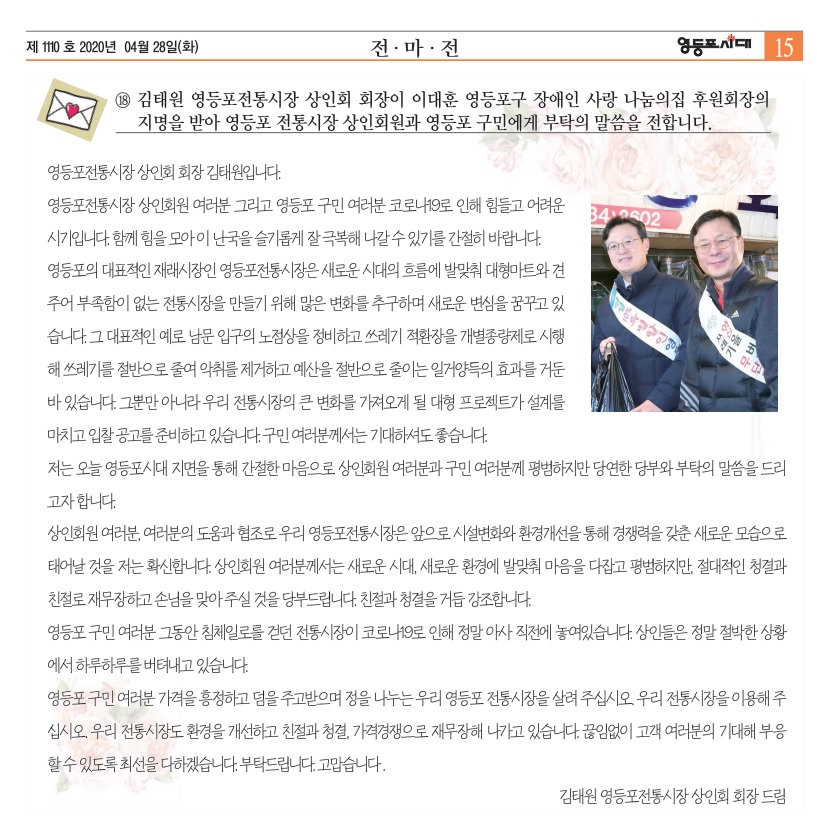 영등포전통시장 상인회원 여러분 그리고 영등포 구민 여러분 코로나19로 인해 힘들고 어려운 시기입니다. 함께 힘을 모아 이 난국을 슬기롭게 잘 극복해 나갈 수 있기를 간절히 바랍니다. 영등포의 대표적인 재래시장인 영등포전통시장은 새로운 시대의 흐름에 발맞춰 대형마트와 견주어 부족함이 없는 전통시장을 만들기 위해 많은 변화를 추구하며 새로운 변심을 꿈꾸고 있습니다. 그 대표적인 예로 남문 입구의 노점상을 정비하고 쓰레기 적환장을 개별종량제로 시행해 쓰레기를 절반으로 줄여 악취를 제거하고 예산을 절반으로 줄이는 일거양득의 효과를 거둔 바 있습니다. 그뿐만 아니라 우리 전통시장의 큰 변화를 가져오게 될 대형 프로젝트가 설계를 마치고 입찰 공고를 준비하고 있습니다. 구민 여러분께서는 기대하셔도 좋습니다. 저는 오늘 영등포시대 지면을 통해 간절한 마음으로 상인회원 여러분과 구민 여러분께 평범하지만 당연한 당부와 부탁의 말씀을 드리고자 합니다. 상인회원 여러분, 여러분의 도움과 협조로 우리 영등포전통시장은 앞으로 시설변화와 환경개선을 통해 경쟁력을 갖춘 새로운 모습으로 태어날 것을 저는 확신합니다. 상인회원 여러분께서는 새로운 시대, 새로운 환경에 발맞춰 마음을 다잡고 평범하지만, 절대적인 청결과 친절로 재무장하고 손님을 맞아 주실 것을 당부드립니다. 친절과 청결을 거듭 강조합니다. 영등포 구민 여러분 그동안 침체일로를 걷던 전통시장이 코로나19로 인해 정말 아사 직전에 놓여있습니다. 상인들은 정말 절박한 상황에서 하루하루를 버텨내고 있습니다. 영등포 구민 여러분 가격을 흥정하고 덤을 주고받으며 정을 나누는 우리 영등포 전통시장을 살려 주십시오. 우리 전통시장을 이용해 주십시오. 우리 전통시장도 환경을 개선하고 친절과 청결, 가격경쟁으로 재무장해 나가고 있습니다. 끊임없이 고객 여러분의 기대해 부응할 수 있도록 최선을 다하겠습니다. 부탁드립니다. 고맙습니다.