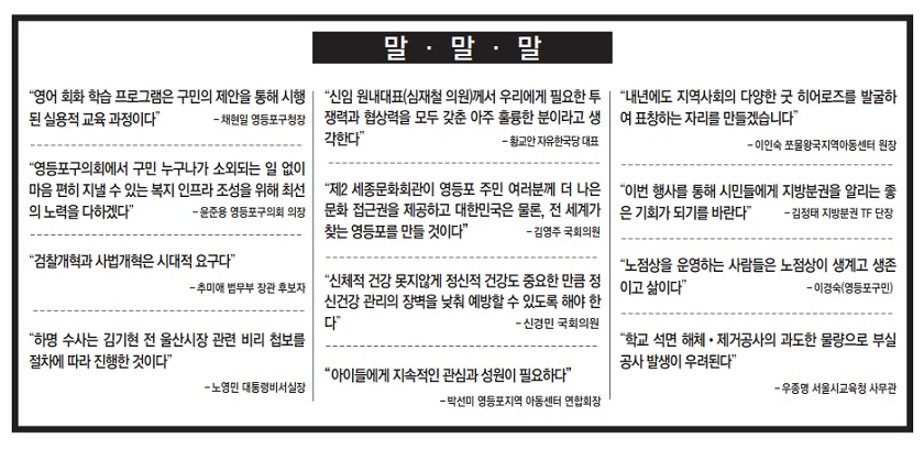 채현일 영등포구청장 “영등포구의회에서 구민 누구나가 소외되는 일 없이 마음 편히 지낼 수 있는 복지 인프라 조성을 위해 최선의 노력을 다하겠다” 윤준용 영등포구의회 의장 “검찰개혁과 사법개혁은 시대적 요구다” 추미애 법무부 장관 후보자 “하명 수사는 김기현 전 울산시장 관련 비리 첩보를 절차에 따라 진행한 것이다” 노영민 대통령비서실장 “신임 원내대표(심재철 의원)께서 우리에게 필요한 투쟁력과 협상력을 모두 갖춘 아주 훌륭한 분이라고 생각한다” 황교안 자유한국당 대표 “제2 세종문화회관이 영등포 주민 여러분께 더 나은 문화 접근권을 제공하고 대한민국은 물론, 전 세계가 찾는 영등포를 만들 것이다” 김영주 국회의원 “신체적 건강 못지않게 정신적 건강도 중요한 만큼 정신건강 관리의 장벽을 낮춰 예방할 수 있도록 해야 한다” 신경민 국회의원 “내년에도 지역사회의 다양한 굿 히어로즈를 발굴하여 표창하는 자리를 만들겠습니다” 이인숙 쪼물왕국지역아동센터 원장 “이번 행사를 통해 시민들에게 지방분권을 알리는 좋은 기회가 되기를 바란다” 김정태 지방분권 TF 단장 “노점상을 운영하는 사람들은 노점상이 생계고 생존이고 삶이다” 이경숙(영등포구민) “아이들에게 지속적인 관심과 성원이 필요하다” 박선미 영등포지역 아동센터 연합회장 “학교 석면 해체•제거공사의 과도한 물량으로 부실공사 발생이 우려된다” 우종명 서울시교육청 사무관