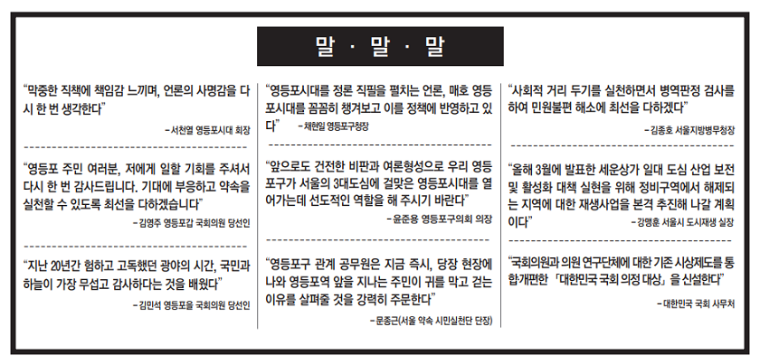 서천열 영등포시대 회장 “영등포 주민 여러분, 저에게 일할 기회를 주셔서 다시 한 번 감사드립니다. 기대에 부응하고 약속을 실천할 수 있도록 최선을 다하겠습니다” 김영주 영등포갑 국회의원 당선인 “지난 20년간 험하고 고독했던 광야의 시간, 국민과 하늘이 가장 무섭고 감사하다는 것을 배웠다”” -김민석 영등포을 국회의원 당선인 “영등포시대를 정론 직필을 펼치는 언론, 매호 영등포시대를 꼼꼼히 챙겨보고 이를 정책에 반영하고 있다” -채현일 영등포구청장 “앞으로도 건전한 비판과 여론형성으로 우리 영등포구가 서울의 3대도심에 걸맞은 영등포시대를 열어가는데 선도적인 역할을 해 주시기 바란다” -윤준용 영등포구의회 의장 “영등포구 관계 공무원은 지금 즉시, 당장 현장에 나와 영등포역 앞을 지나는 주민이 귀를 막고 걷는 이유를 살펴줄 것을 강력히 주문한다” -문종근(서울 약속 시민실천단 단장) “사회적 거리 두기를 실천하면서 병역판정 검사를 하여 민원불편 해소에 최선을 다하겠다” -김종호 서울지방병무청장 “올해 3월에 발표한 세운상가 일대 도심 산업 보전 및 활성화 대책 실현을 위해 정비구역에서 해제되는 지역에 대한 재생사업을 본격 추진해 나갈 계획이다” -강맹훈 서울시 도시재생 실장 “국회의원과 의원 연구단체에 대한 기존 시상제도를 통합․개편한 「대한민국 국회 의정 대상」을 신설한다” -대한민국 국회 사무처 “올해는 도시재생 뉴딜사업 4년 차로 주민들이 체감할 수 있는 성과를 창출해야 하는 시점이다” -이소영 국토교통부 주거재생과 과장 “교원의 정치단체 결성 및 가입 금지 규정에 대한 헌재의 위헌 결정을 환영한다” -전국 통합공무원노동조합 “이번 화재 사례를 통해서 소화기 한 대가 초기소화에 얼마나 도움이 되는지 알 수 있었다. 유사시 누구나 보이는 소화기를 이용해 달라” -영등포 소방서 관계자 “5월에 등교, 개학은 온라인 개학처럼 학년별로 차례대로 이루어질 것으로 예상된다” -김영철 서울시 부교육감